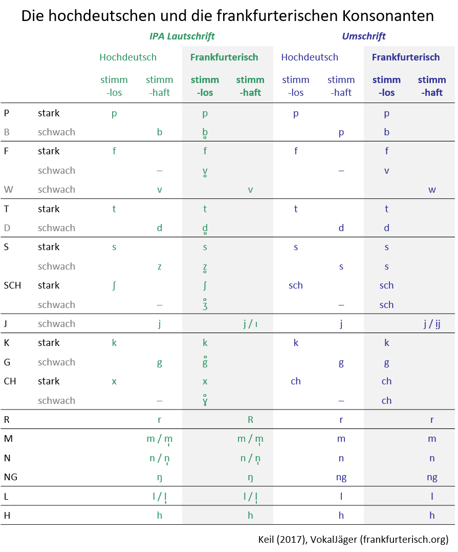 Die Konsonanten des Frankfurter Dialekts sind denen des Hochdeutschen sehr ähnlich, doch gibt es einige wesentliche Unterschiede. Zunächst werden die Konsonanten des Hochdeutschen und des Frankfurterischen gegenübergestellt [Siebs 1912 S. 59–83; Mangold 2005; Keil 2017, Abb. 33, S. 270]. Die linken Spalten zeigen die Frankfurter Konsonanten in IPA-Lautschrift, die rechten in der einfacheren Umschrift. Links außen ist der Laut an sich aufgeführt: das P, das B, das F usw. Die Frankfurter Lautzeichen sind jeweils mit einer grauen Fläche unterlegt und so in der Grafik hervorgehoben. Man beachte, dass die Konsonanten jeweils stimmhaft und stimmlos sowie stark (Fortis) und schwach (Lenis) auftreten können. So nicht anders angegeben, handelt es sich um den in Rauh (1921a) dokumentierten Lautstand für Frankfurt um 1920 [vgl. auch Keil 2017, S. 268]: