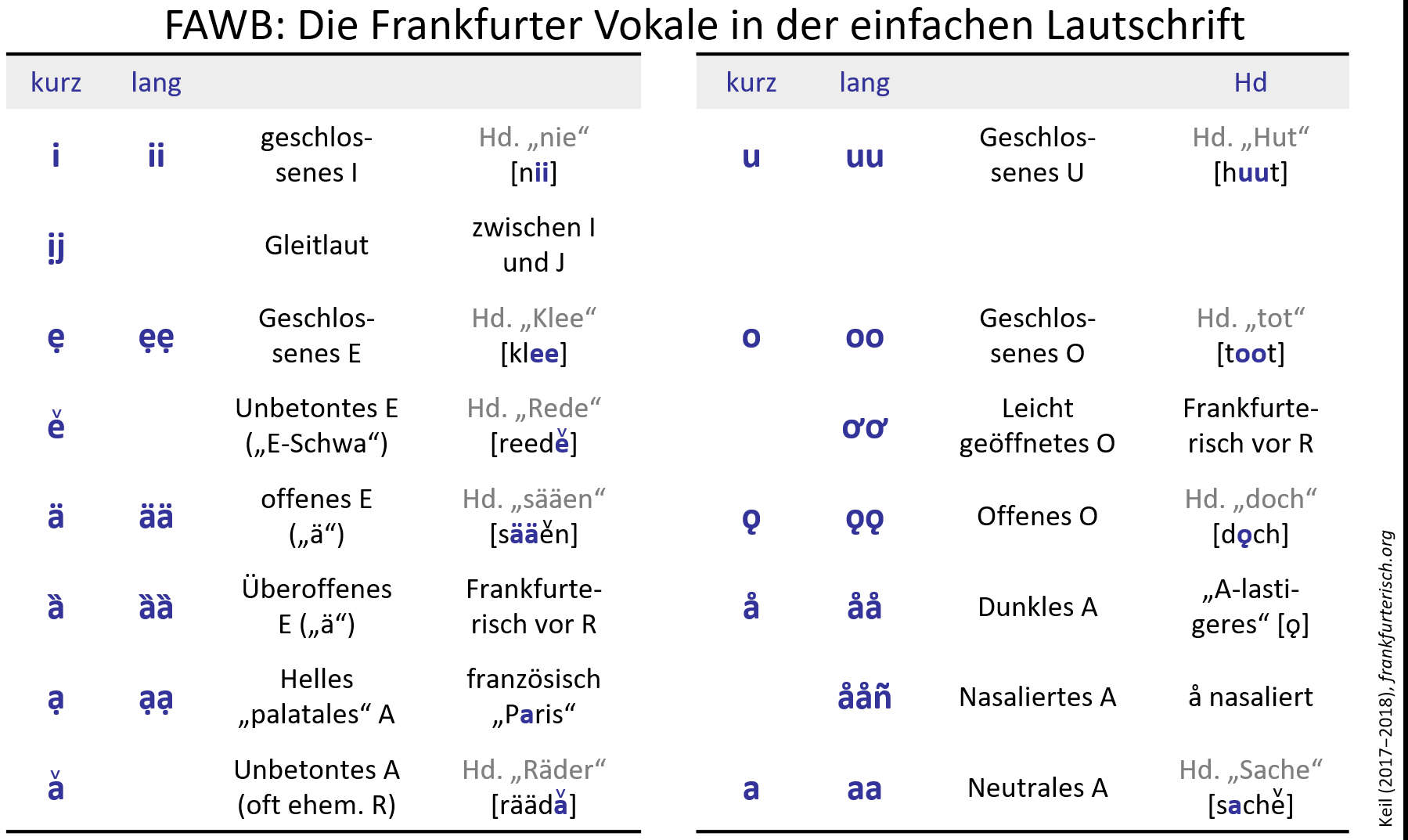 Um die Merkmale des Frankfurterischen deutlich beschreiben zu können, bedarf es einer sogenannten Lautschrift, die die Aussprache der Wörter sauber umschreibt bzw. bezeichnet. Hier soll die in der Wissenschaft bzw. Phonetik übliche Lautschrift der International Phonetic Association (IPA) verwendet werden, die für das Frankfurterische angepasst wurde [IPA 1999; Keil 2017, S. S. 268-270]. In der präzisen IPA-Form beschreibt man z.B. das deutsche Verb sagen hochsprachlich mit [zaːgən], wobei das [z] für das stimmhafte S steht, das [ə] schwaches unbetontes E repräsentiert und das [aː] beschreibt das lange neutrale A und der Doppelpunkt [ː] zeigt dessen Vokallänge an.