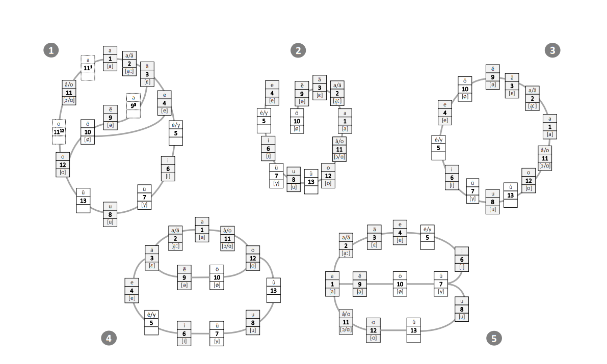 Bild 1 ist aus Band 1, Faszikel 1; die anderen aus Band II, Faszikel 4 und überschrieben mit Versuch die Vocaltöne in eine zusammenhängende Beziehung zu bringen (alle Zeichnungen sind undatiert). Bild 5 ist annotiert mit mglw. am besten und zeigt Ähnlichkeit mit einer (liegenden) modernen Anordnung. Die von Hand gezeichneten Originale weisen meist nur Oppels Vokalnummern auf, hier sind Oppels übliche Schreibungen (oben) und der angesetzte IPA-Lautwert (unten) ergänzt. Die wesentlichen Vokale, die er systematisch nutzte, sind grau hinterlegt.
