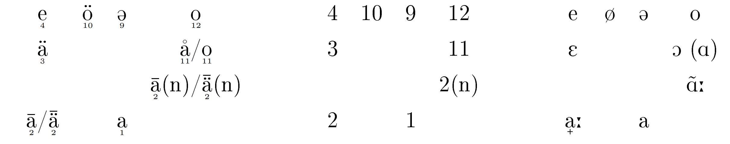 | ā / ā̃ | ɑː / ɑ̃ː | ååñ | langes dunkles A (Periode 4; ggfs. nasaliert) | |