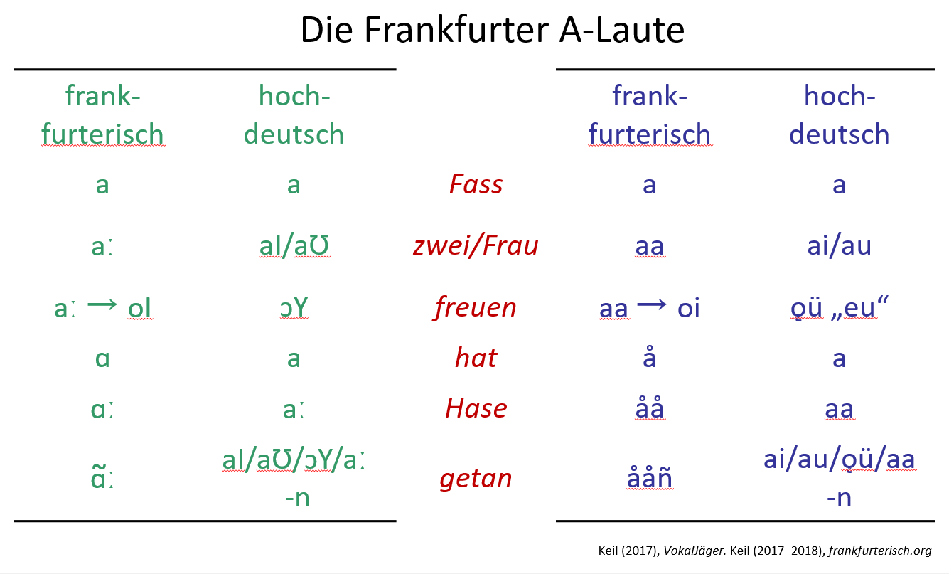 - Der Lautwert des frankfurterischen dunklen A war nicht konstant, was mit dem Pfeil in obigem Diagramm angezeigt wird. Man kann annehmen, dass es im 19. Jahrhundert deutlich dunkler und O-ähnlicher war, was mit dem Lautsymbol [ɔ] bzw. ǫ – offenes O – angezeigt wird [Keil 2017, S. 309-310 und S. 319-320].