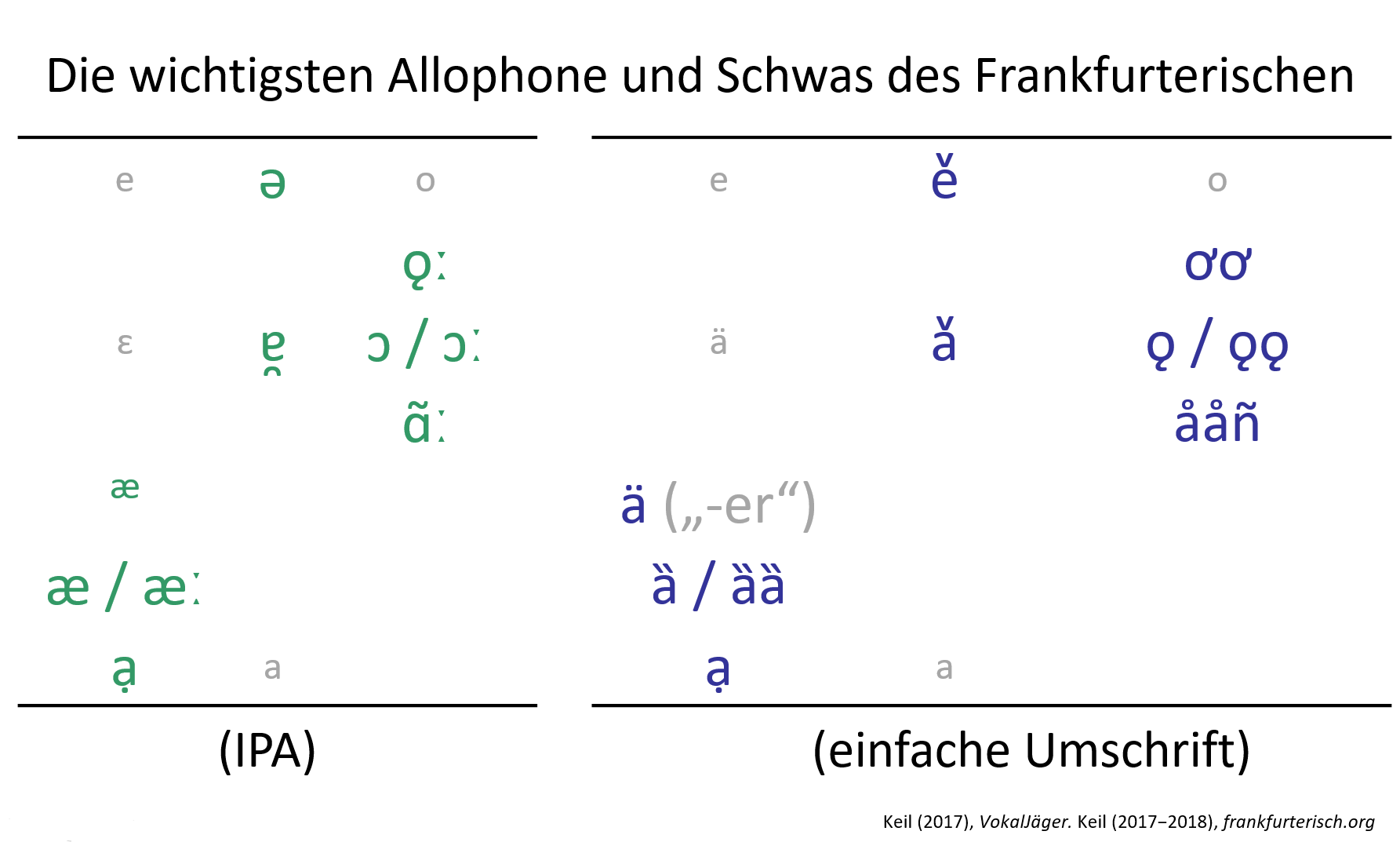 Es folgen die Laute des Frankfurter Stadtdialekts [Keil 2017, Tab. 58, S. 412]: