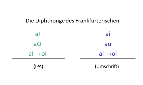 - Die zweite Komponente ist für alle drei Diphthonge immer offenes I, also [ɪ], bzw. offenes U, also [ʊ]. Das ist identisch zum Hochdeutschen bis auf EU, wo die hochdeutsche Aussprache eine leichte Ü-Färbung hat, die es so natürlich im entrundeten Frankfurter Stadtdialekt nicht geben kann.