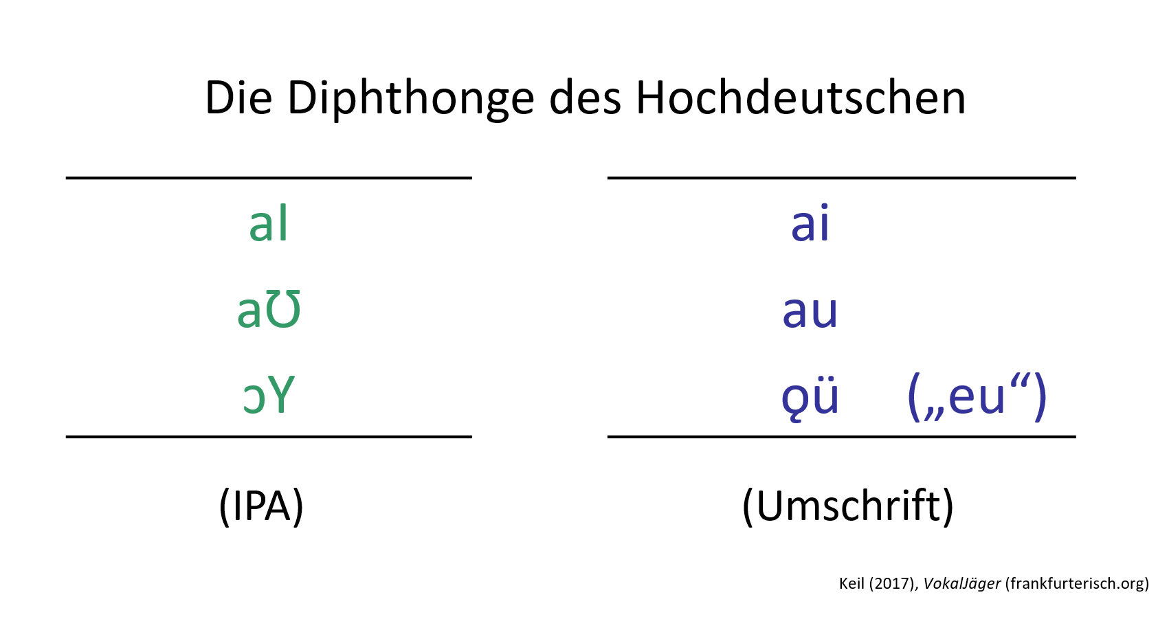 Bei den Diphthongen („Zweiklängen“) sind die Unterschiede zwischen dem Hochdeutschen nach Mangold (2005)
