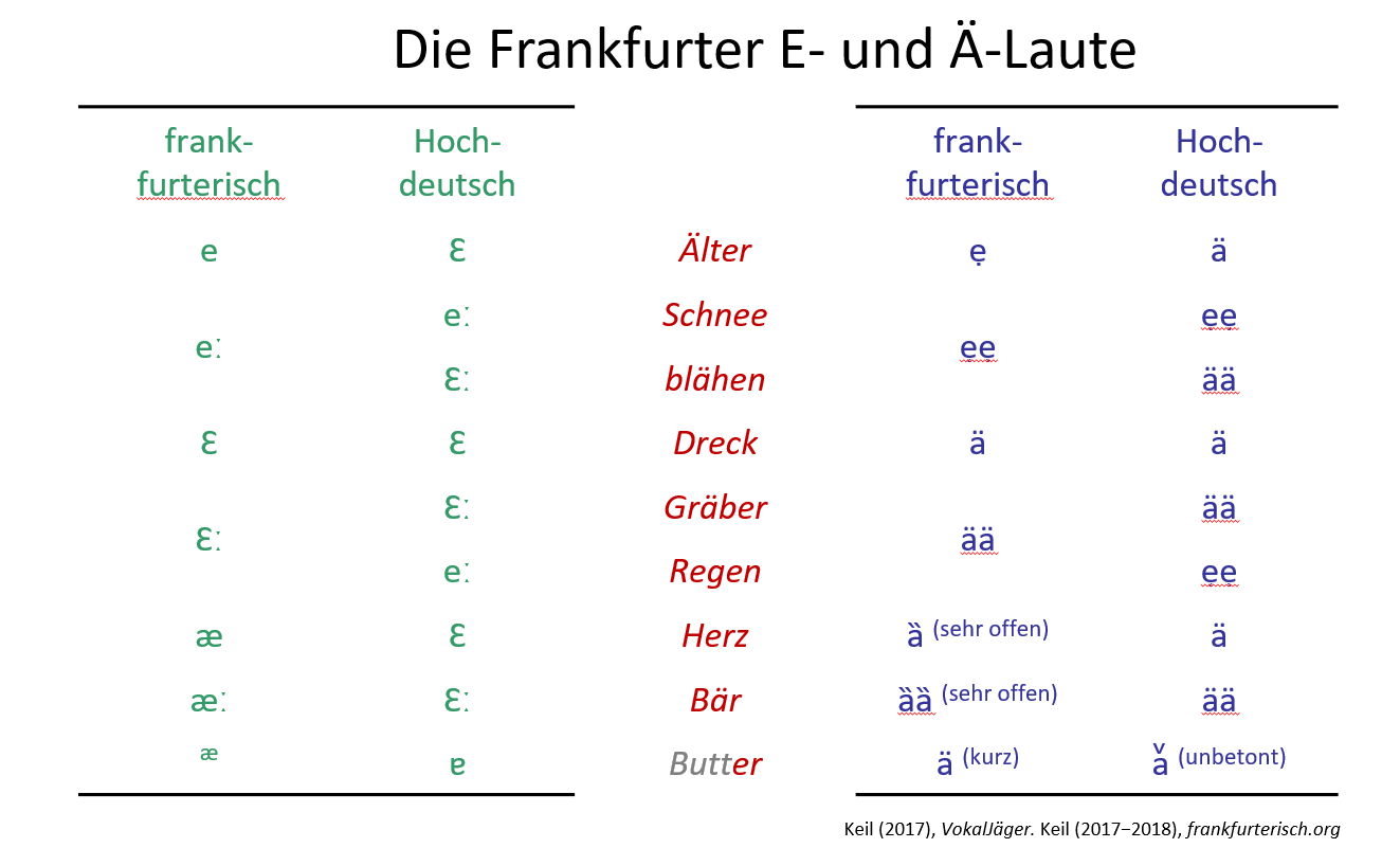 Der Frankfurter Dialekt hingegen hatte regelmäßig in bestimmten Wörtern kurzes geschlossenes E, also mit dem Zeichen [e], wie z. B. in älter, [eldæ] bzw. ẹlldä, oder Bett, [bet] bzw. bẹtt. Damit wich die Aussprache vom Hochdeutschen ab: Ist das Hochdeutsche her für kurze E/Ä mehr zum Ä geneigt war die Frankfurter Mundart näher am E. In anderen Wörtern tauchte hingegen derselbe Ä-Laut wie im Hochdeutschen auf, z. B. in Äpfel mit [ɛbḷ] bzw. äbbl.