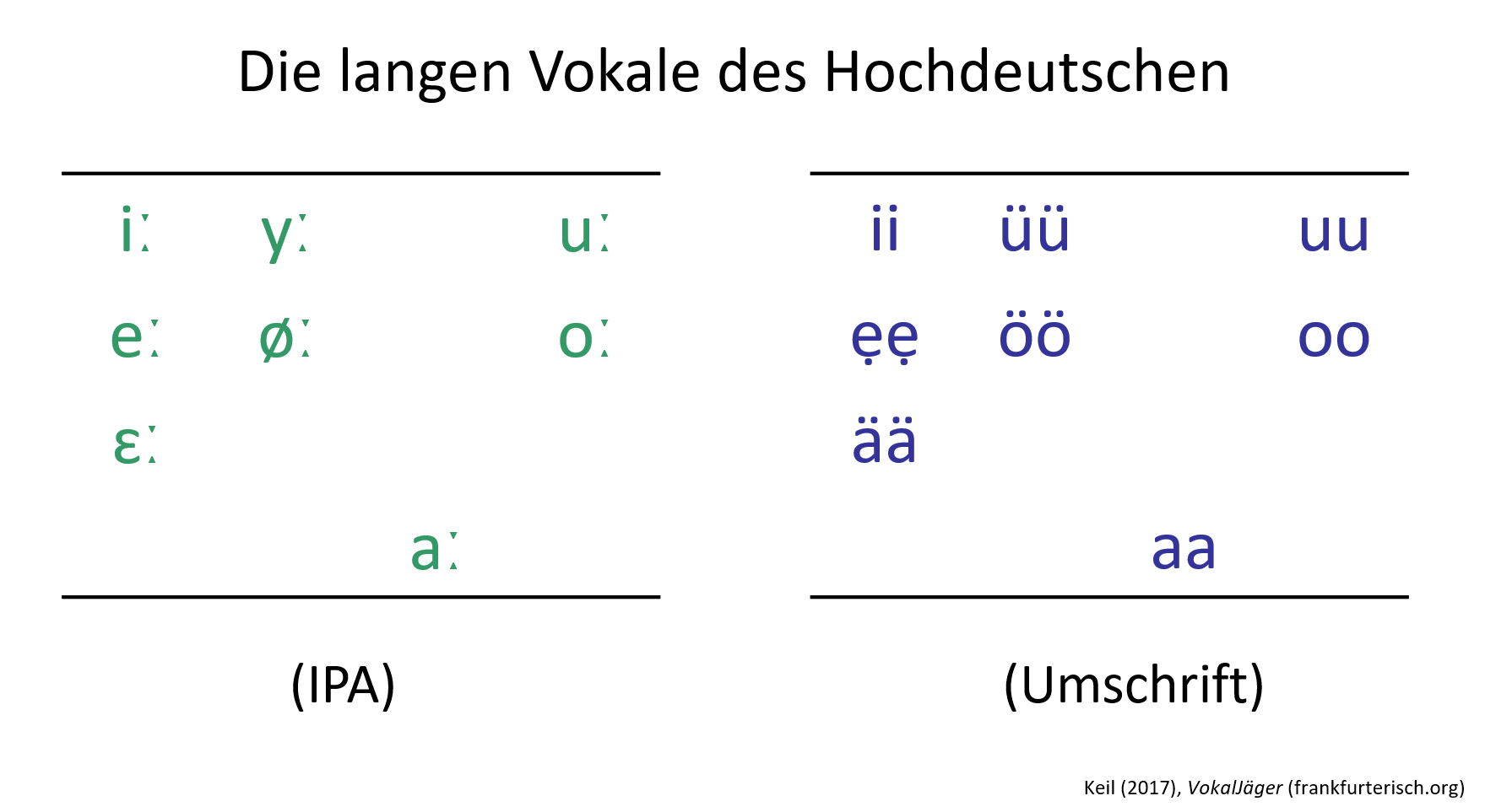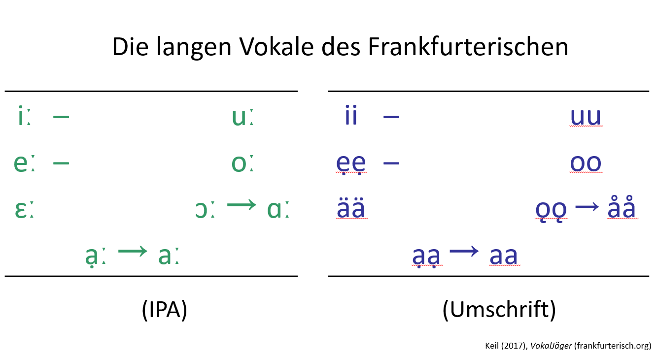 Nun folgen zum Vergleich die langen Vokale des Frankfurterischen [Keil 2017, Tab. 58, S. 412]: